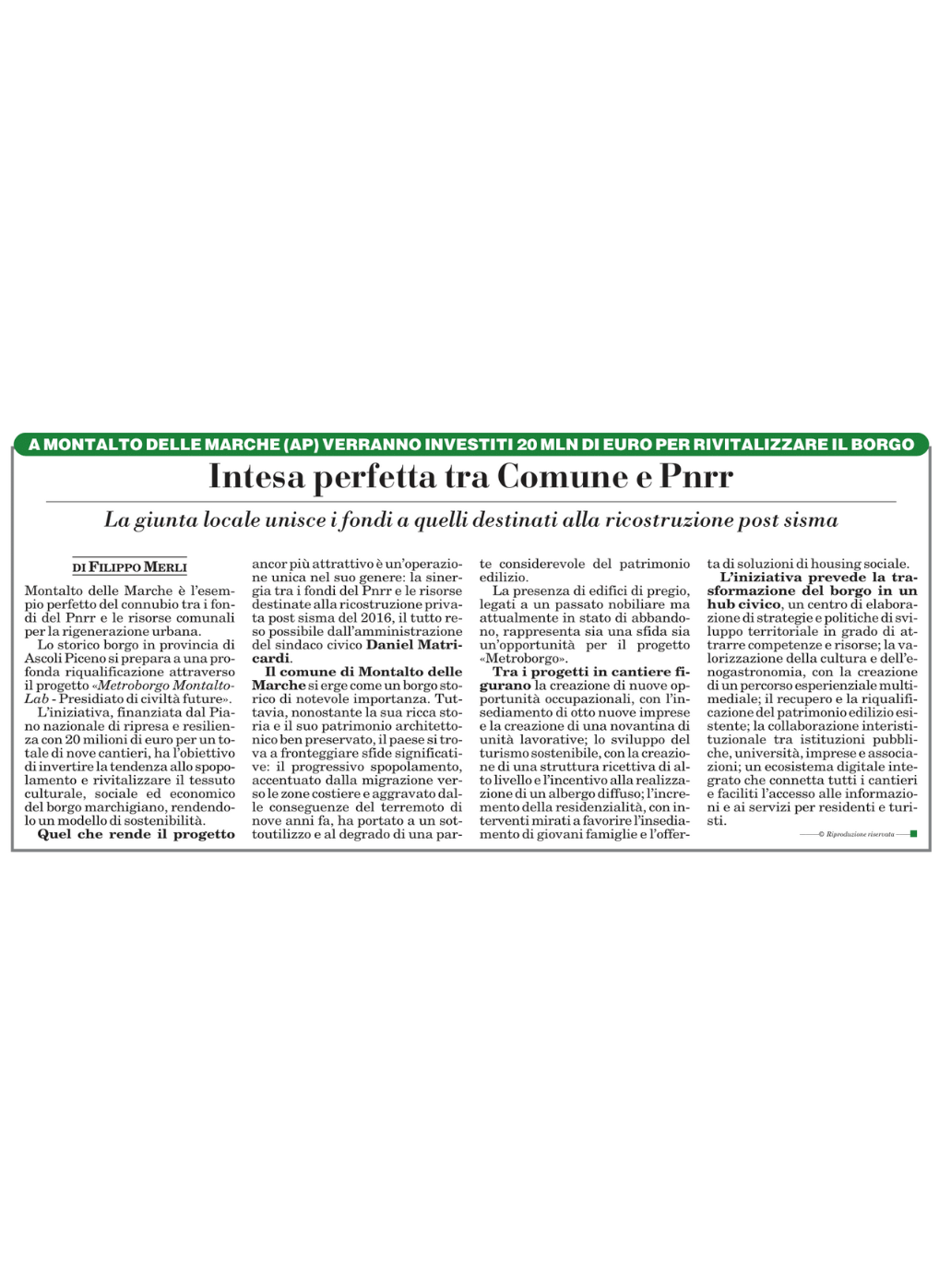 Il Comune di Montalto ha costituito la “Fondazione Metroborgo”, un soggetto giuridico necessario all’attuazione e alla sostenibilità futura dell’intero progetto. Il Comune di Montalto ha costituito la “Fondazione Metroborgo”, un soggetto giuridico necessario all’attuazione e alla sostenibilità futura dell’intero progetto.