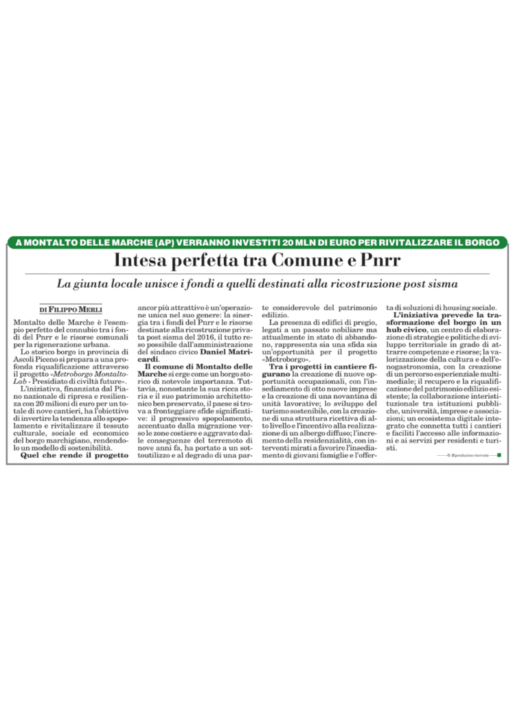 Il Comune di Montalto ha costituito la “Fondazione Metroborgo”, un soggetto giuridico necessario all’attuazione e alla sostenibilità futura dell’intero progetto. Due le tempistiche di intervento previste. Il Comune di Montalto ha costituito la “Fondazione Metroborgo”, un soggetto giuridico necessario all’attuazione e alla sostenibilità futura dell’intero progetto.